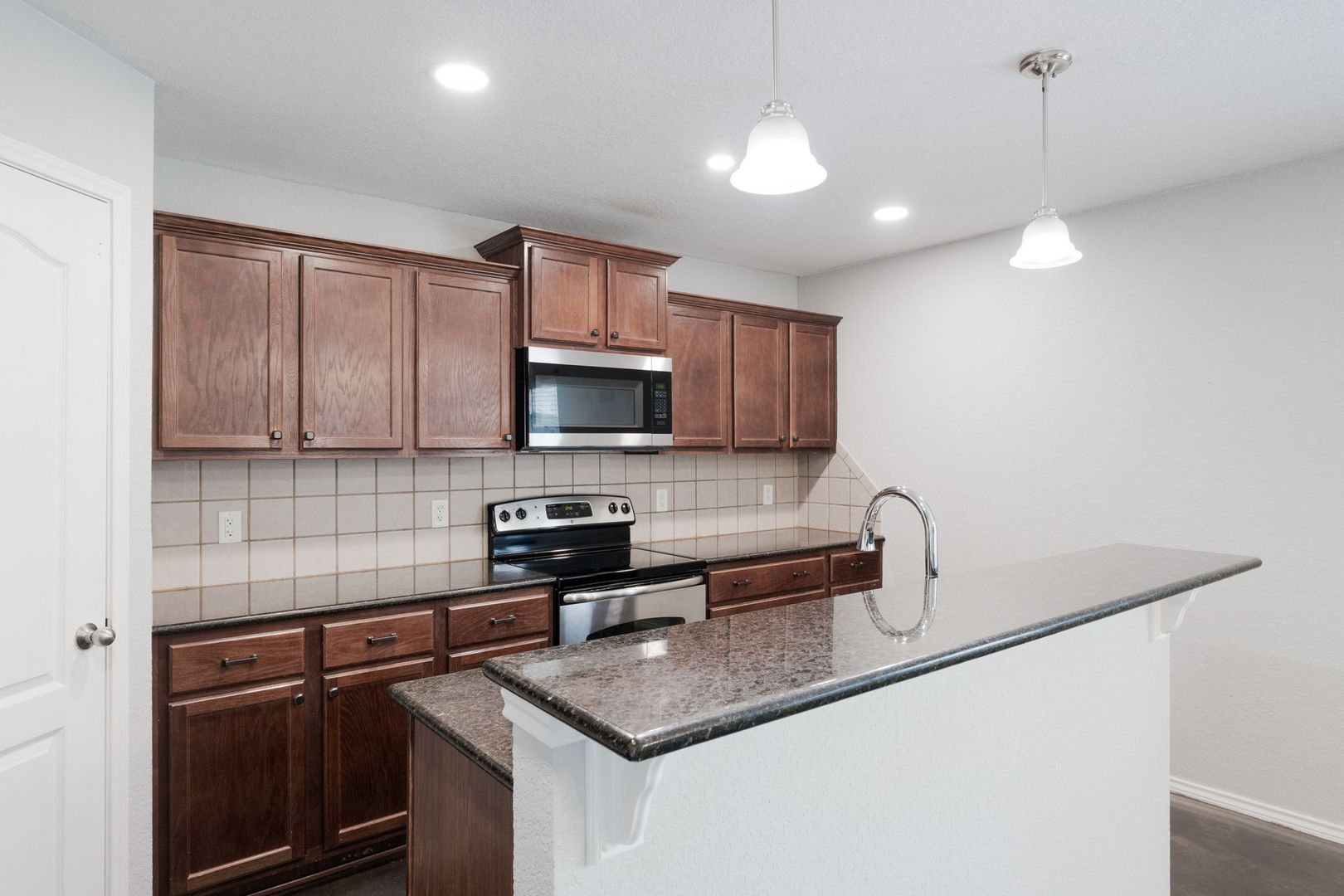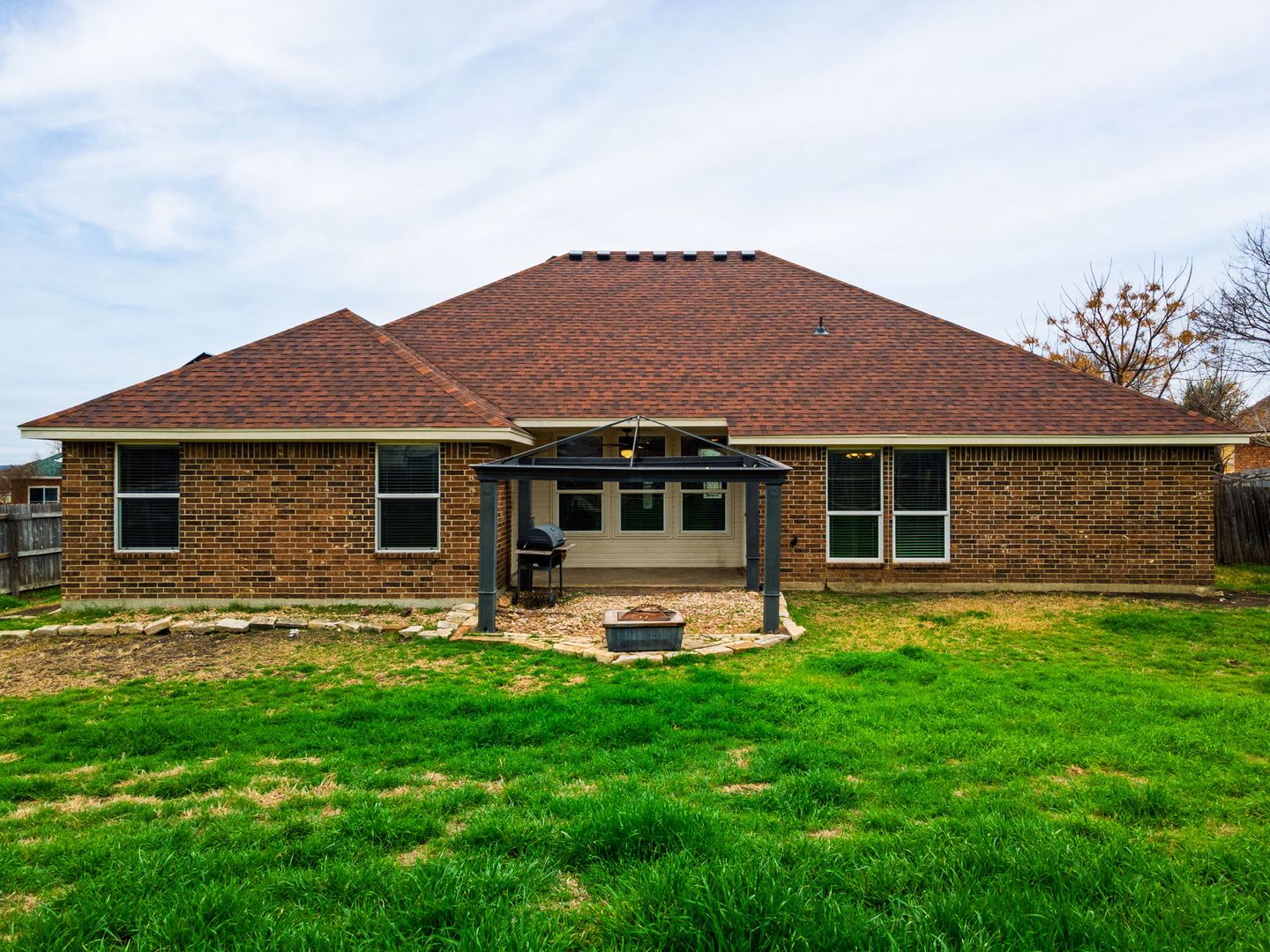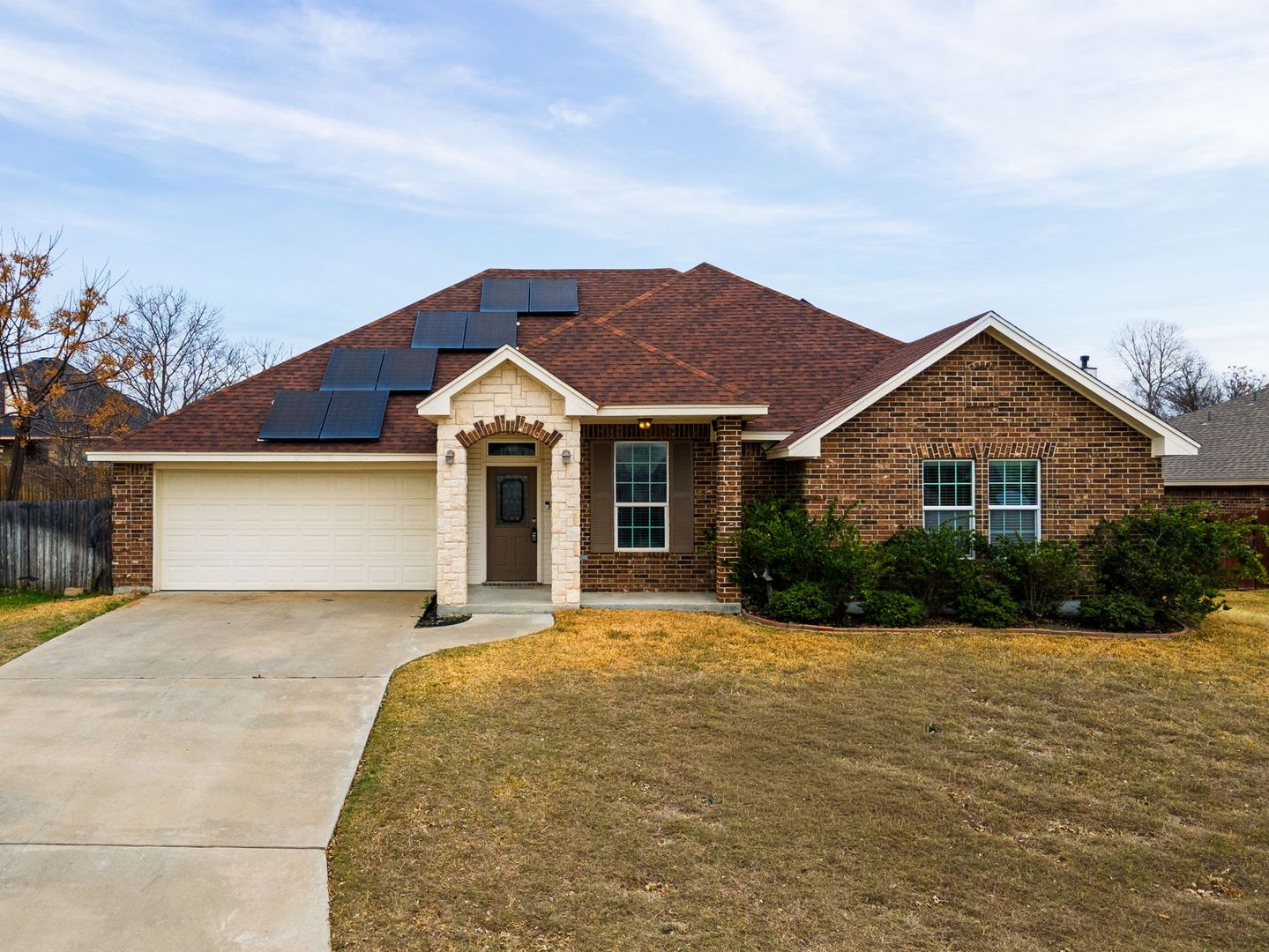 Welcome to the stunning property located in the desirable Wildwood Estates in Nolanville, TX. This spacious home boasts 1942 square feet of living space, featuring 4 generously sized bedrooms and 2 full bathrooms. The primary bathroom is a haven of relaxation with a separate shower, a garden tub, and a double vanity. The kitchen is a chef's dream, equipped with granite counters, a pantry, a microwave vent hood, and stainless steel appliances, including a side-by-side refrigerator. The bar top adds a touch of elegance and convenience for entertaining. The home also features a separate laundry room and a 2-car garage for added convenience. The stained concrete flooring throughout the home adds a modern and stylish touch. The property is surrounded by a wood privacy fence, and the inground sprinkler system ensures easy maintenance of the outdoor space. The home is also equipped with solar panels, making it energy efficient.